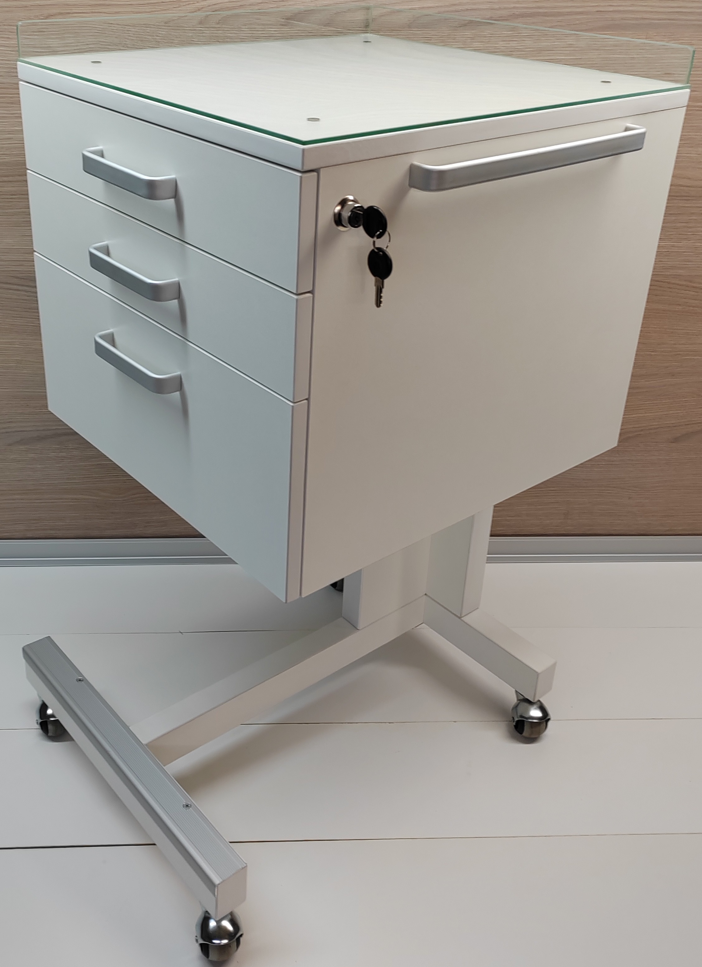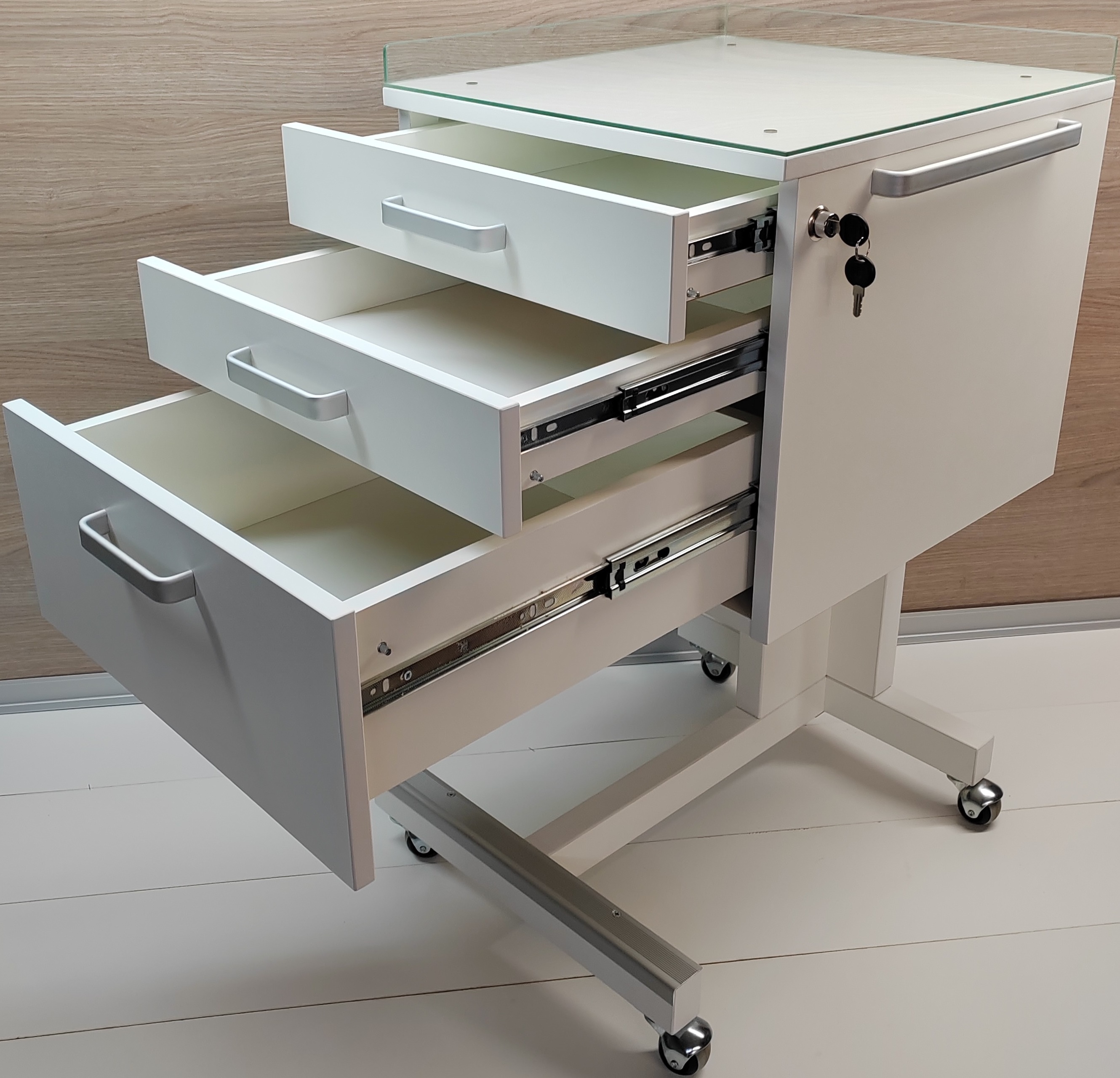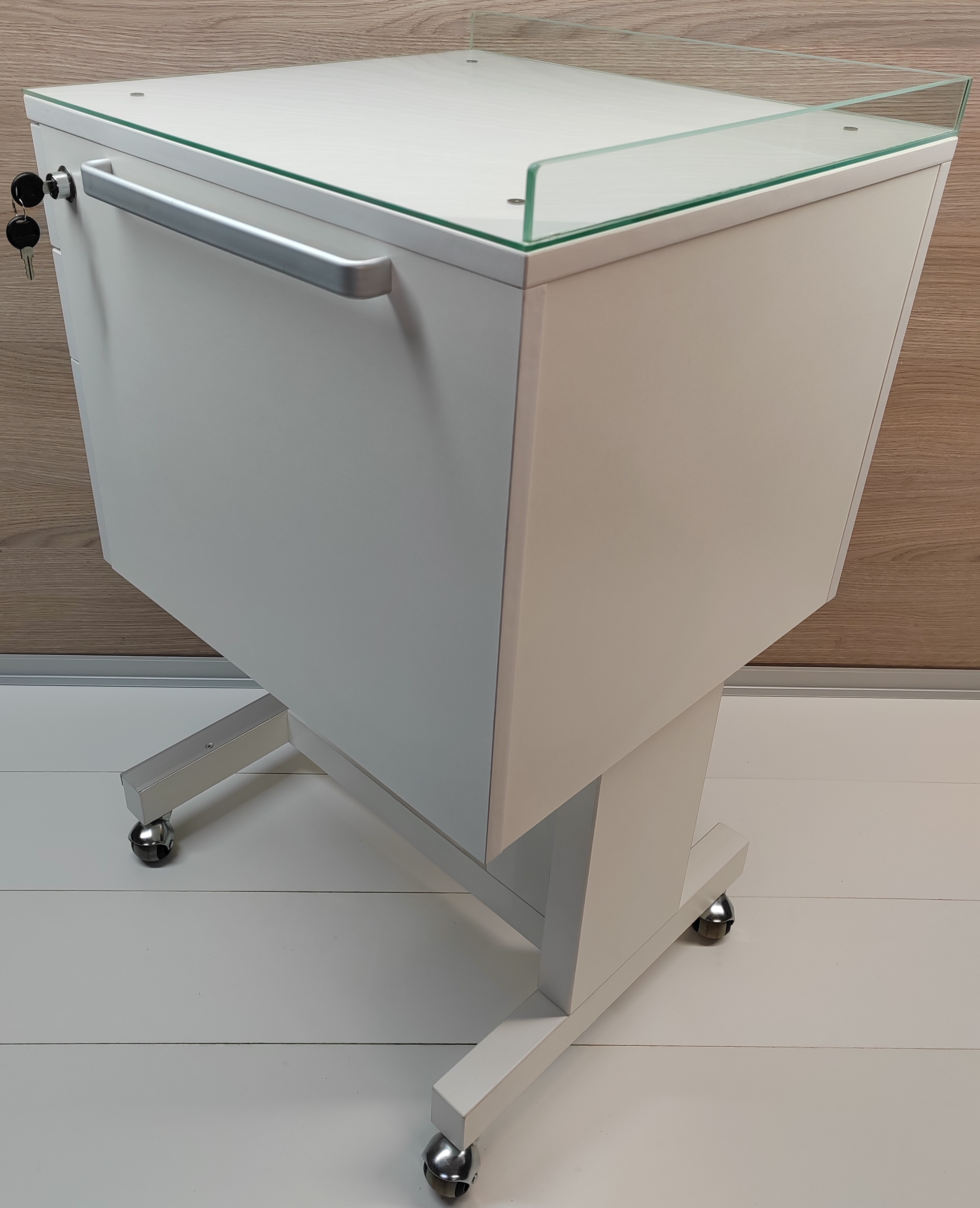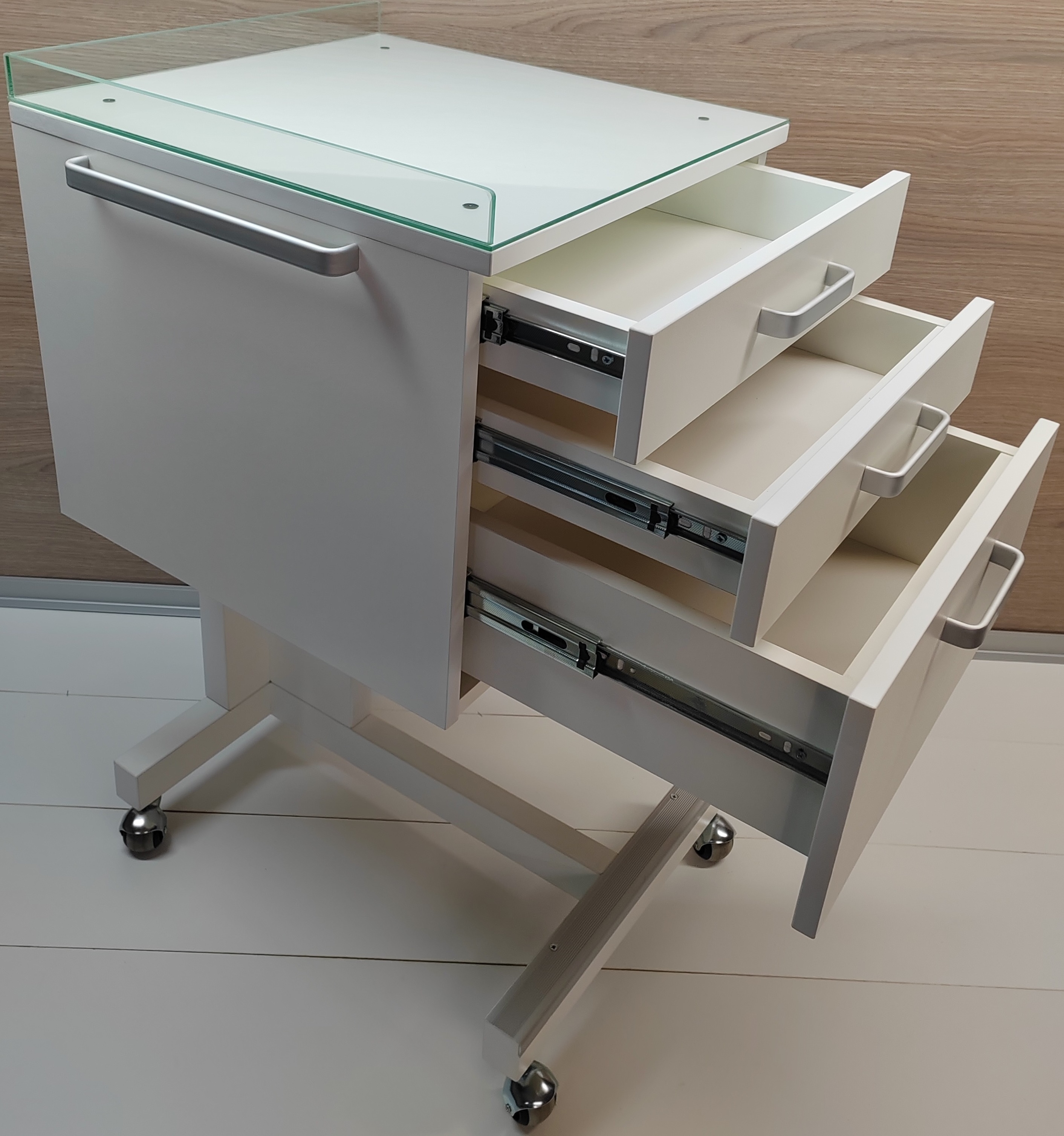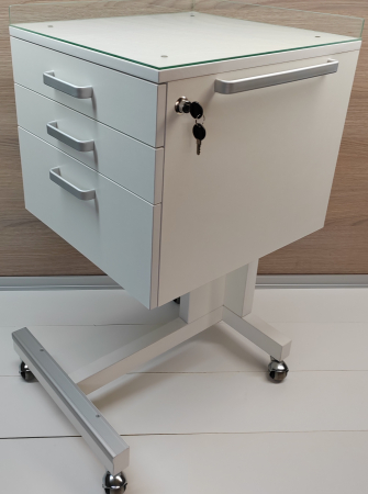 Столик стоматологический СС 2-1 предназначается для удобства в проведении стоматологических процедур, стоматологического кабинета и установки. По сторонам стоматологического столика установлены металлические ручки для перемещения. Столик стоматологичекий передвигается на роликах, подкатной. Центральный замок столика стоматологического закрывает все выдвижные ящики одновременно. Стекло (4 мм.) с бортиками (6 мм.) Стекло снимается поднятием в верх. Изготовлен из влагозащищенной ЛДСП. Поверхность стола стоматолога не боится большинства видов химии. Нижняя часть выступает вперед на (90 мм). Низ изготовлен из трехслойной фанеры, прочно закреплен, и усилен металлическими крепежами и профилем. Стол для стоматологии поставляется в собранном виде. Поверхность стомат столика относительно вынослива к легким царапинам.