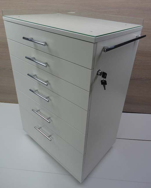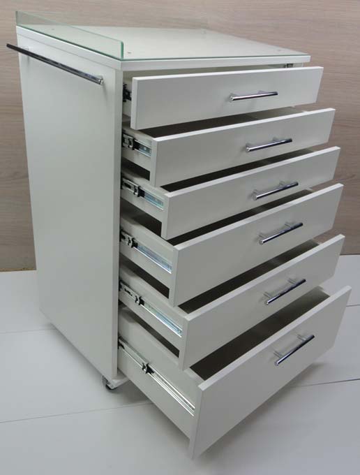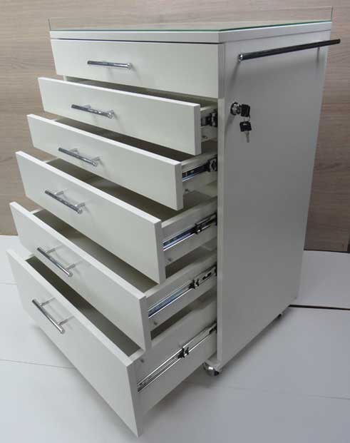 Столик для стоматологии СС-3 передвижной, подкатной, мобильный, на колесах. Столик стоматологический предназначается для удобства приема пациента и хранения стоматологического оборудования и материалов. Данный стоматологический столик тумба очень вместителен. Все шесть ящиков столика закрываются одним центральным замком, что значительно сказывается на завершении приема и легкости рабочего процесса. Не нужно носить и искать кучу ключей, только один ключ один стоматологическиий столик, в комплекте два ключика. Механизмы выдвижения ящиков на стомат столе телескопические, подшипниковые. Стекло стоматологического столика бу дет легко сниматся легким поднятием вверх. Поверхности,покрытию столика не навредит большинство видов моющей и вредной химии даже ацетон, относительно вынослива к царапинам.