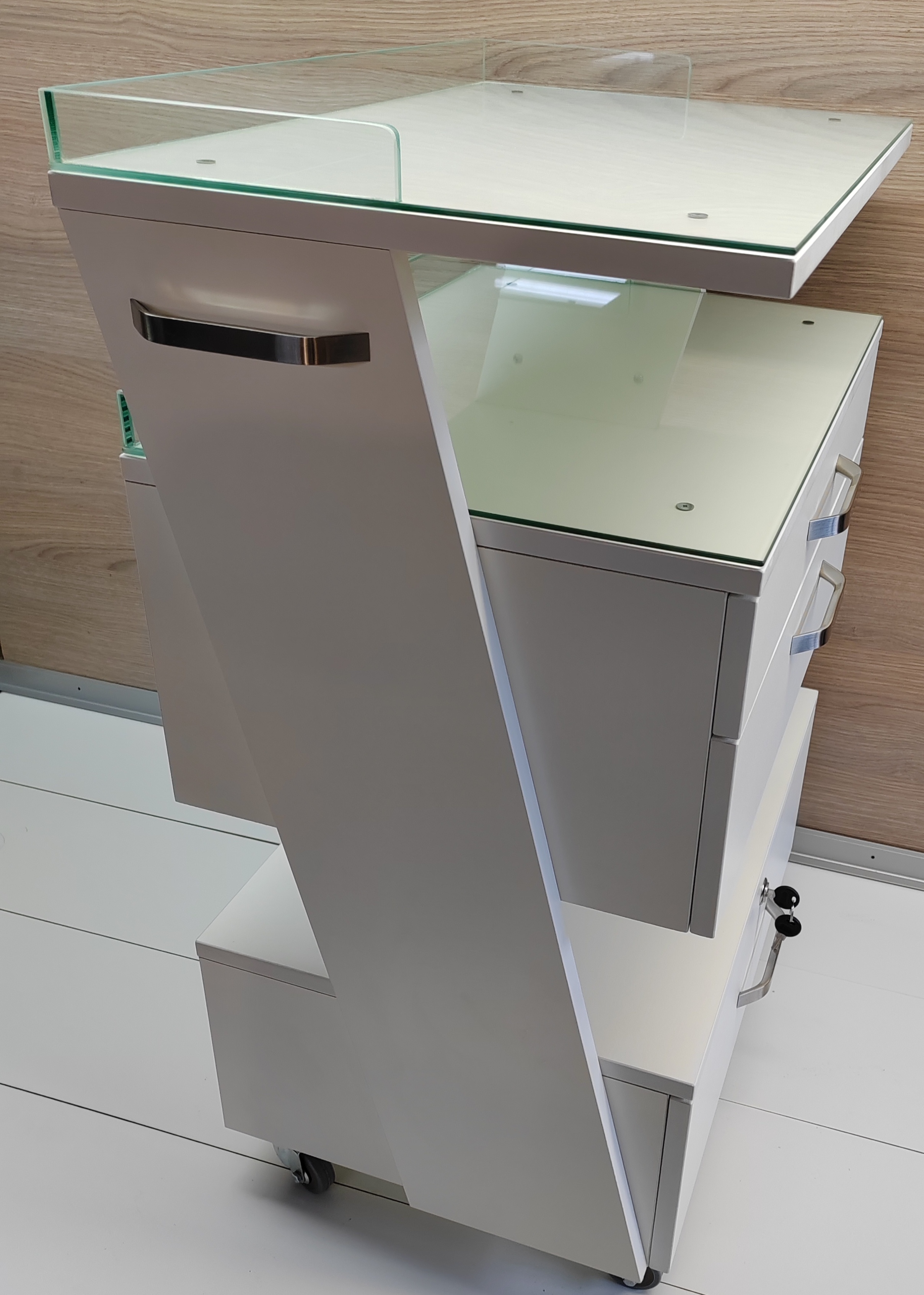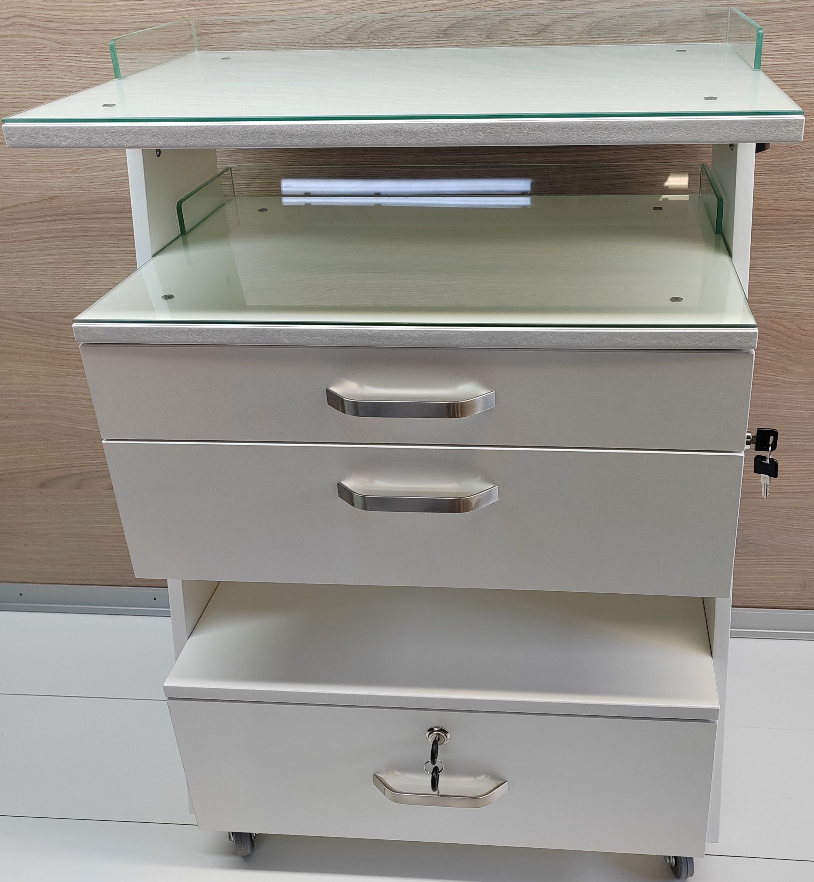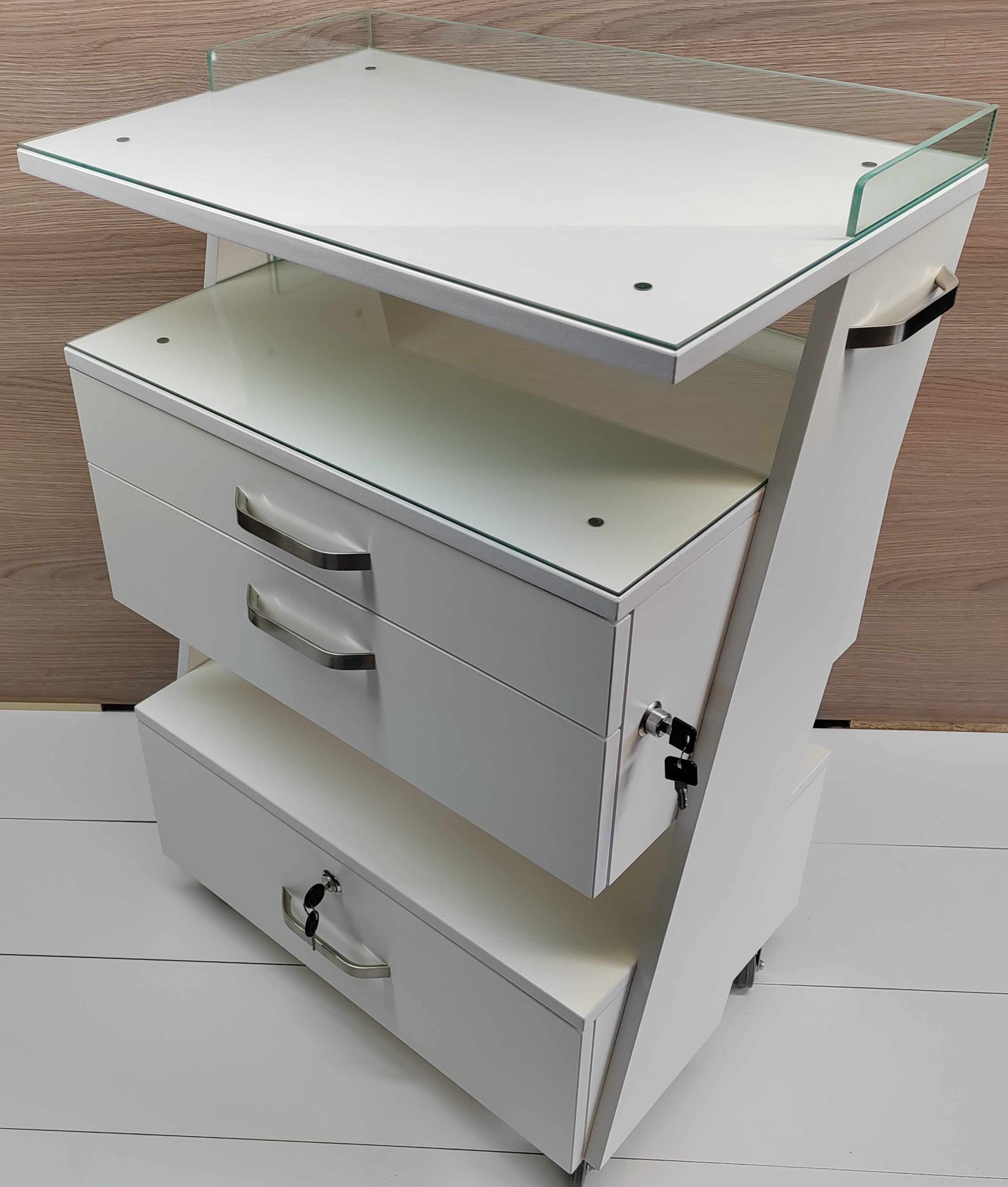 Столик манипуляционный СС-5 в медицинский или стоматологический кабинет, клинику. Дизайн и белый цвет медицинского столика универсальный. На верхней крышке медицинского стола, присутствует стекло (4 мм.) с бортиками (6 мм.) Бортики препятствуют случайному падению, расположенных на крышке, медицинских или стоматологических материалов и инструментов. Стекло легко снимается поднятием вверх. Ящики закрываются центральным замком. Нижний ящик закрывается отдельным замком. В медицинском столике три выдвижных ящиков разных размеров (описание размеров ниже). Поверхности медицинского столика не причинит вреда химия применяемая в медицине и стоматологии. Поверхность относительно устойчива к царапинам. Медицинский столик мобильный, передвижной, на роликах-колесиках, подкатной. Стол медицинский доставляется собранным.