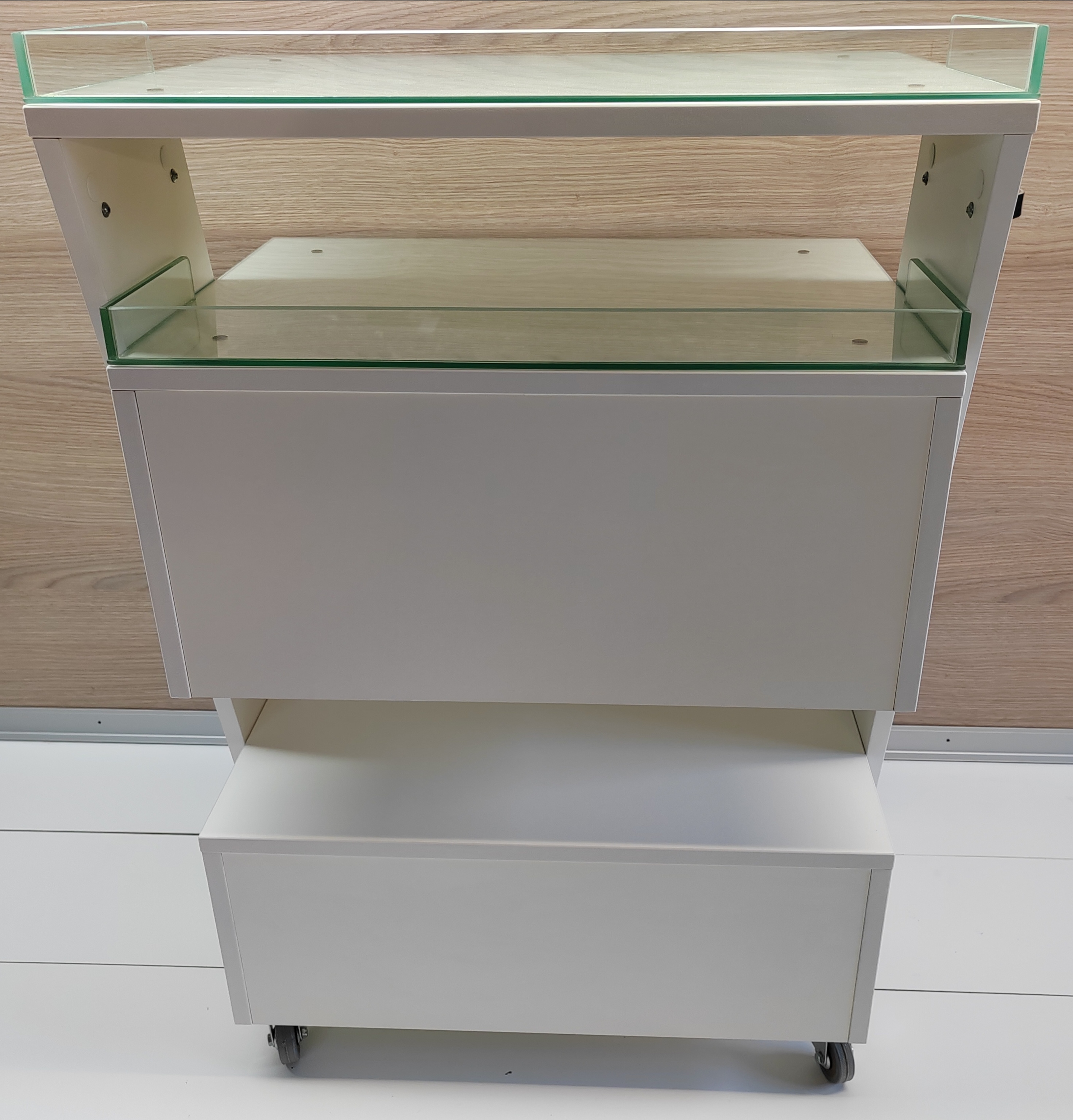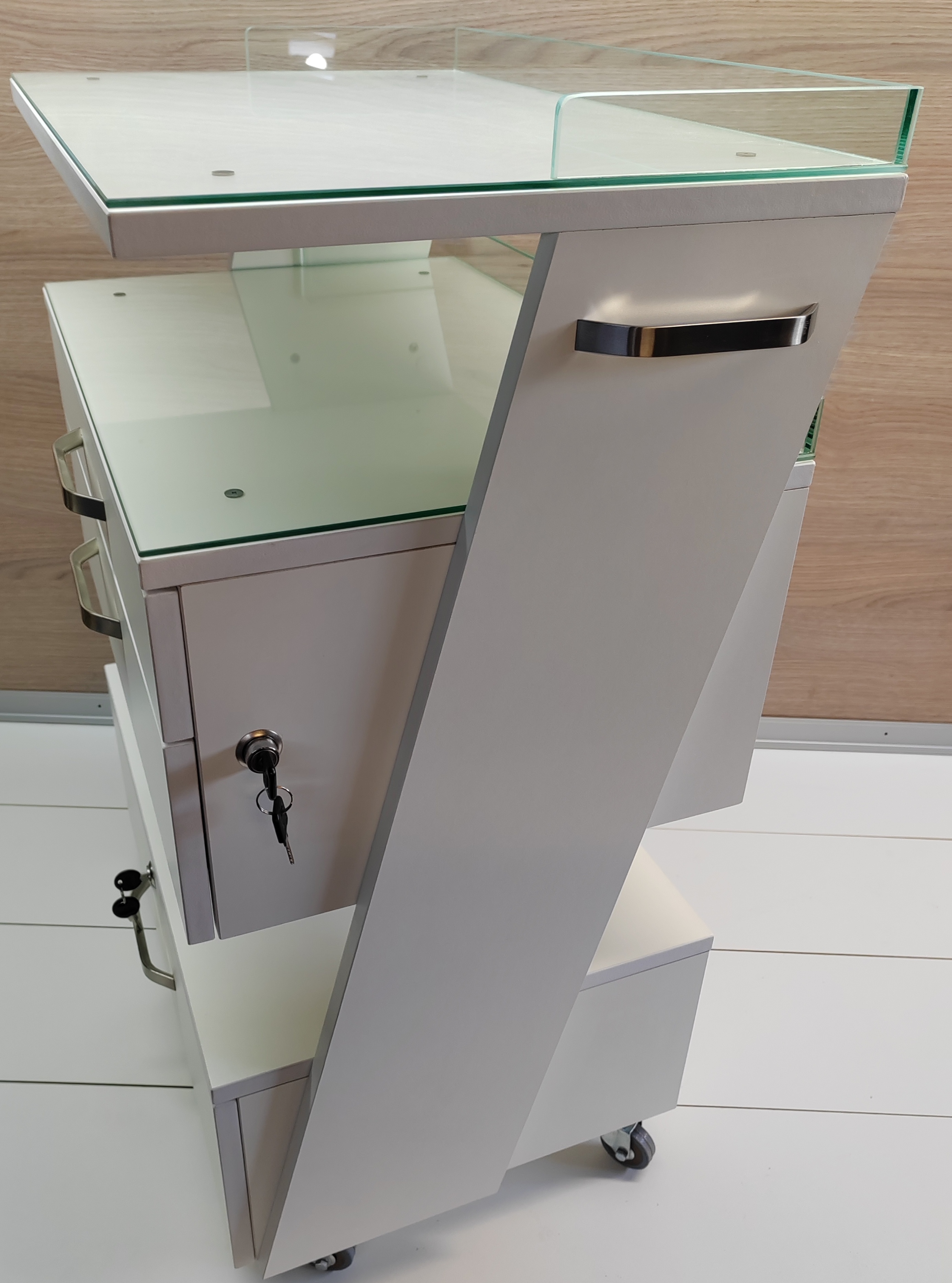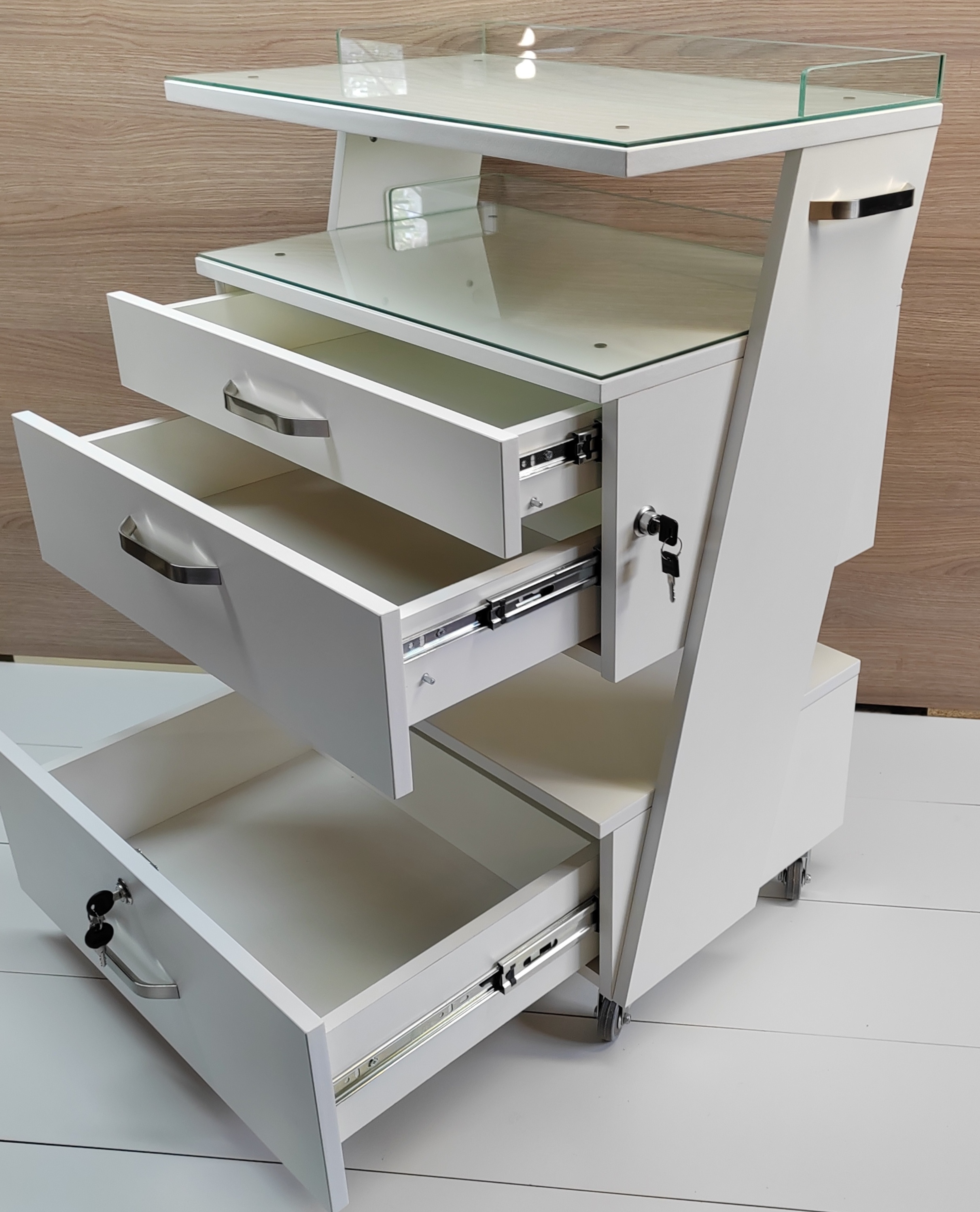 Столик манипуляционный СС-5 в медицинский или стоматологический кабинет, клинику. Дизайн и белый цвет медицинского столика универсальный. На верхней крышке медицинского стола, присутствует стекло (4 мм.) с бортиками (6 мм.) Бортики препятствуют случайному падению, расположенных на крышке, медицинских или стоматологических материалов и инструментов. Стекло легко снимается поднятием вверх. Ящики закрываются центральным замком. Нижний ящик закрывается отдельным замком. В медицинском столике три выдвижных ящиков разных размеров (описание размеров ниже). Поверхности медицинского столика не причинит вреда химия применяемая в медицине и стоматологии. Поверхность относительно устойчива к царапинам. Медицинский столик мобильный, передвижной, на роликах-колесиках, подкатной. Стол медицинский доставляется собранным.